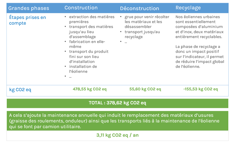 Selon l’Ademe, l’empreinte carbone du photovoltaïque est de 55 g CO2 eq/KWh sur 20 ans. Nous sommes donc très fiers de pouvoir dire que nos éoliennes urbaines semblent être l’énergie renouvelable urbaine la moins chère en coût carbone !